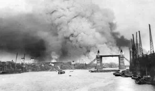 Поглед на Темзу и Tower Bridge током првог масовног бомбардовања Лондона 7. септембра 1940.