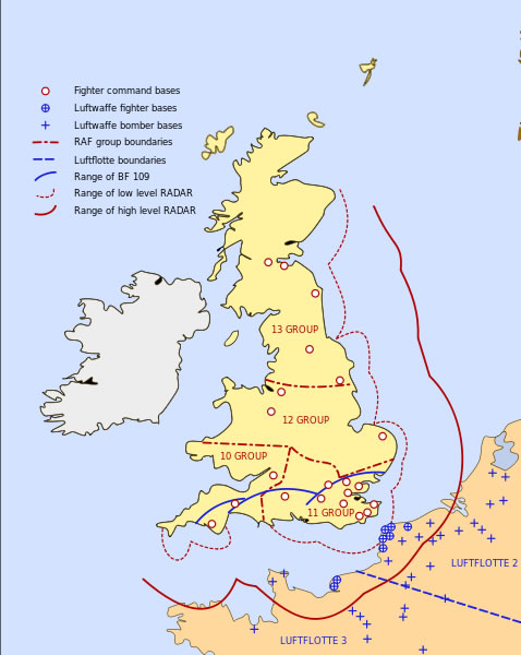 Целокупном ваздушном одбраном британских острва руководила је Ловачка команда са седиштем у Стенмору. Ова одбрана била је у почетку организована само у јужној и југоисточној Енглеској, али су убрзо предузете мере (паралелно са набавком ловачких авиона и других средстава) да се ова одбрана прошири на западну Енглеску и северну Шкотску. Територија британских острва (изузев северозападне Енглеске и северне Шкотске) подељена је на 4 ваздушне зоне, с тим што је за одбрану сваке зоне била предвиђена по једна група ловачке авијације (бр. 10, 11, 12. и 13.): 11. група, јачине 23 сквадрона, бранила је југоисточну,10. група са 4 сквадрона – југозападну, 12. група са 13. сквадрона – централну и 13. група са 12 сквадрона – северну зону Енглеске. Ваздушне зоне биле су подељене на секторе, који су обухватали групу аеродрома. Тежиште одбране било је на 11. ловачкој групи, која је штитила Лондон и области Есекс, Кент, Сасекс и Хемпшир. Поред тога, за одбрану северозападне Енглеске и северне Шкотске (које нису улазиле у састав ваздушних зона) биле су још у формирању две (бр. 9. и 14.) ловачке групе.