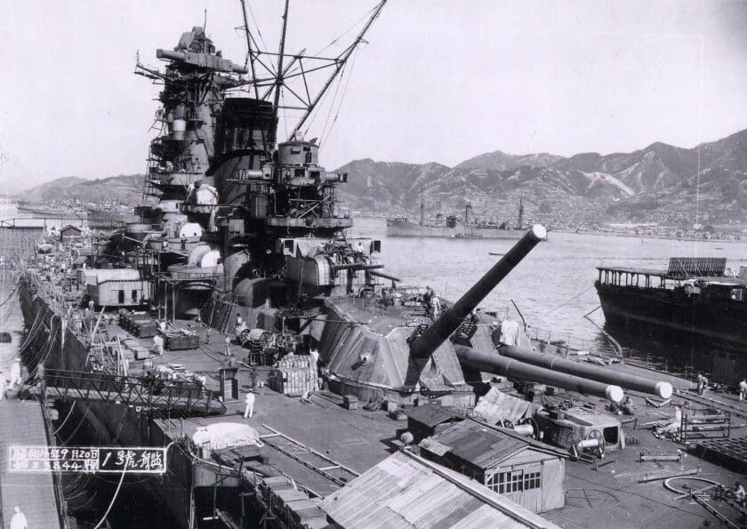 Бојни брод Yamato у бродоградилишту Куре, снимљен 20. септембра 1941, са носачем авиона Hosho и логистичким бродом Mamiya.