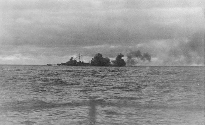Након торпедног напада из ваздуха, „нови“ курс Бизмарка је довео до смањења даљине до крстарице Шефилд, која се након испаљеног плотуна са Бизмарка склања под димну завесу. Крстарица тада није директно погођена, али јој шрапнели онеспособљавају радар и рањавају 12 чланова посаде, од којих 6 касније подлежу ранама. Овај догађај приморава крстарицу да прекине контакт са Бизмарком, али већ у 2200 она наилази на 4. флотилу разарача којима даје податке о вероватној позицији Бизмарка.