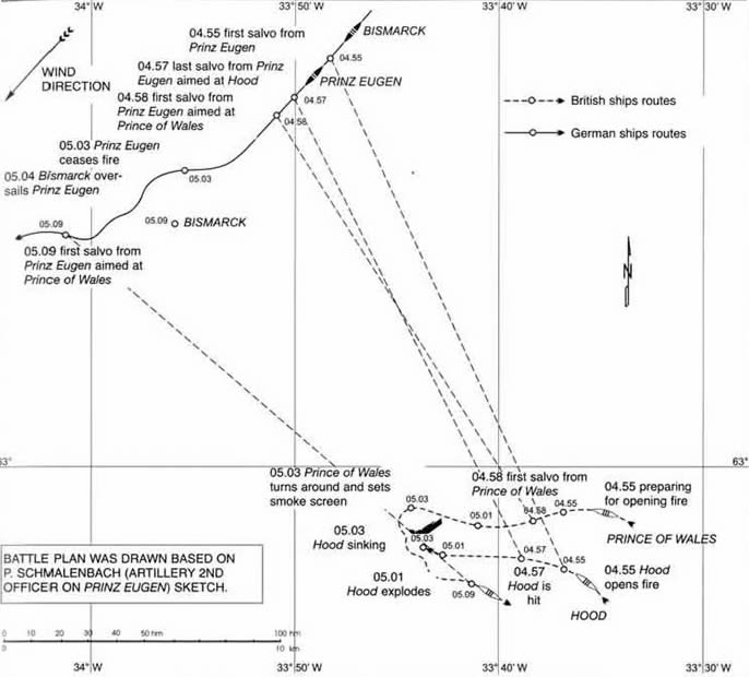 У рано јутро 24. маја, време се пролепшало и видљивост се значајно поправила. Немачка група бродова је пловила у курсу 220º брзином од 28 чворова, када је у 0525 часова хидрофон са Принца Еугена открио шумове од пропелера два брода са његове леве стране. У 0537 часова Немци успостављају визуелни контакт са бродом за који су у први мах помислили да је лака крстарица, на даљини од 19 миља. У 0543, по левом боку брода примећују још један брод, неидентификовани. Узбуна је дата и на Бизмарку и на Принц Еугену. Артиљерци нису имали тада најважнији податак, врсту противничког брода, како би изабрали одговарајућу муницију. На пречац су закључили да се ради о крстарици… изабрана су експлозивна зрна калибра 203 мм (Spgr. L/4,7).  У том тренутку, британски ратни бродови (бојни крсташ Худ и бојни брод Принц од Велса) су се приближавали немачким бродовима пловећи брзином од 28 чворова, у курсу 280º.