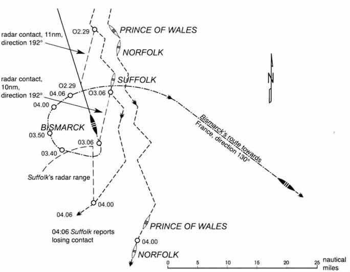 Наређење вицеадмирала Вејк Вокера да крстарица Сафолк промени поставиште у борбеној групи сада је показало своје последице. Ово наређење је дало Бизмарку простор за маневар, што је овај и учинио. Са Сафолком на старом поставишту, Бизмарку би било много теже да прекине контакт са потером.