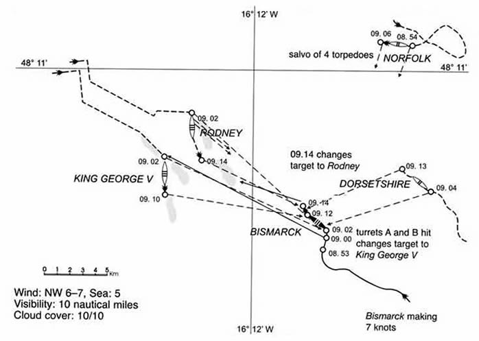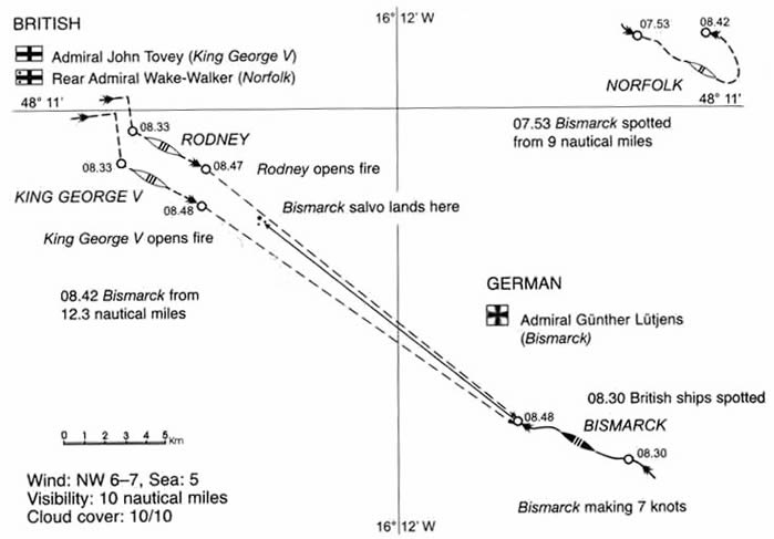 У 0833 часова бродови HMS King George V и HMS Rodney улазе у курс 110º и 10 минута касније, приметли су Бизмарка, на даљини од 23000 м. Родни отвара ватру у 0847, праћен артиљеријом са Кинг Џорџа V. Даљина је у том тренутку износила неких 20000 метара. Бизмарк узвраћа ватру у 0849 из прамчаних купола (куполе „Антон“ и „Бруно“), гађајући Роднија. У 0854, борби се придружује крстарица Норфолк са својим топовима калибра 203 мм. У 0858 се оглашава секундарна артиљерија са Роднија. У 0902 часова Бизмарк је примио неколико погодака који су оштетили надграђе и јарболе, уништивши том приликом вршни даљиномер. У 0904 стрељачком строју се придружује и тешка крстарица Дорсетшајр (HMS Dorsetshire) која тек што је пристигла, отвара ватру. Два бојна брода и две тешке крстарице су стајале наспрам Бизмарка. У 0908 часова бива уништен прамчани даљиномер и из употребе испадају куполе „Антон“ и „Бруно“.  Управљање ватром је пребачено у крмени део брода. Са те позиције, четврти артиљеријски официр управља са четири плотуна на бојни брод Краљ Џорџ V. На несрећу, тек што је „уракљио“ противника, зрном 356 мм бива уништена купола и Бизмарк остаје без управљања ватром. Тада крмене куполе крећу у самостално гађање, гађајући притом Роднија, који у међувремену лансира салву од 6 торпеда. Ни једно од торпеда не погађа.