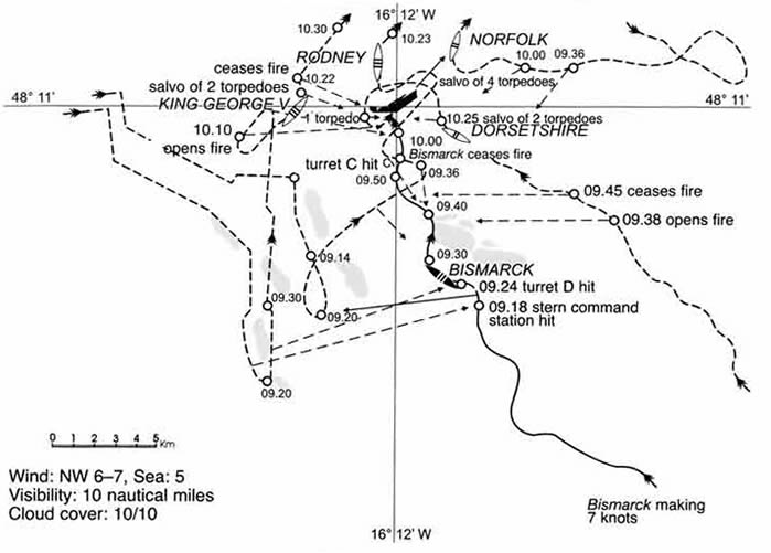 Видевши да је Бизмарк изгубио способност за борбу, Родни се „јуначки“ приближава на неких 2500 до 4000 метара и наставља гађање топовима 406 мм. Зрна једна за другим погађају непомични брод… У 0940 услед пожара долази до експлозије куполе „Бруно“. У 0956 Родни лансира још два торпеда са даљине од 2700 метара, са једним могућим поготком у бок брода. Са ове даљине нико није могао да промаши… зрна су погађала брод, али он још увек није тонуо…Нешто након 1000 часова, крстарица Норфолк лансира 4 торпеда са даљине од 3600 метара, од којих је само једно торпедо можда погодило мету. Процедура за потапање брода је завршена, и посада почиње да напушта брод скачући преко ограде. Сви Бизмаркови топови су били ван строја, сваки усмерен у другом правцу. Димњак и надграђе брода су били изрешетани на много места. На неким местима палуба је личила на кланицу. Главни јарбол је још увек стајао на свом месту, са све ратном заставом. Родни прекида ватру у 1016, и адмирал Тови услед утрошка горива бива приморан да напусти бојиште.