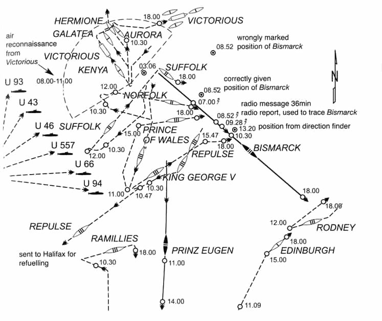 У ноћи 22/23. маја по пријему извештаја, Винстон Черчил јавља Френклину Рузвелту: „Јуче, двадесетпрвог, „Бизмарк“, „Принц Еуген“ и 8 трговачких бродова лоцирано је у Бергену. Ниска облачност није дозволила напад.Вечерас (открили смо) су испловили. Имамо разлоге да верујемо да се планира напад на Атлантику. Уколико их не ухватимо како излазе, ваша морнарица би сигурно могла да их уочи за нас. „King George V“, „Prince of Wales“, „Hood“, „Repulse“ и носач авиона „Victorious“ са још мањих бродова трагају за њима. Дајте нам новости и ми ћемо завршити посао.“